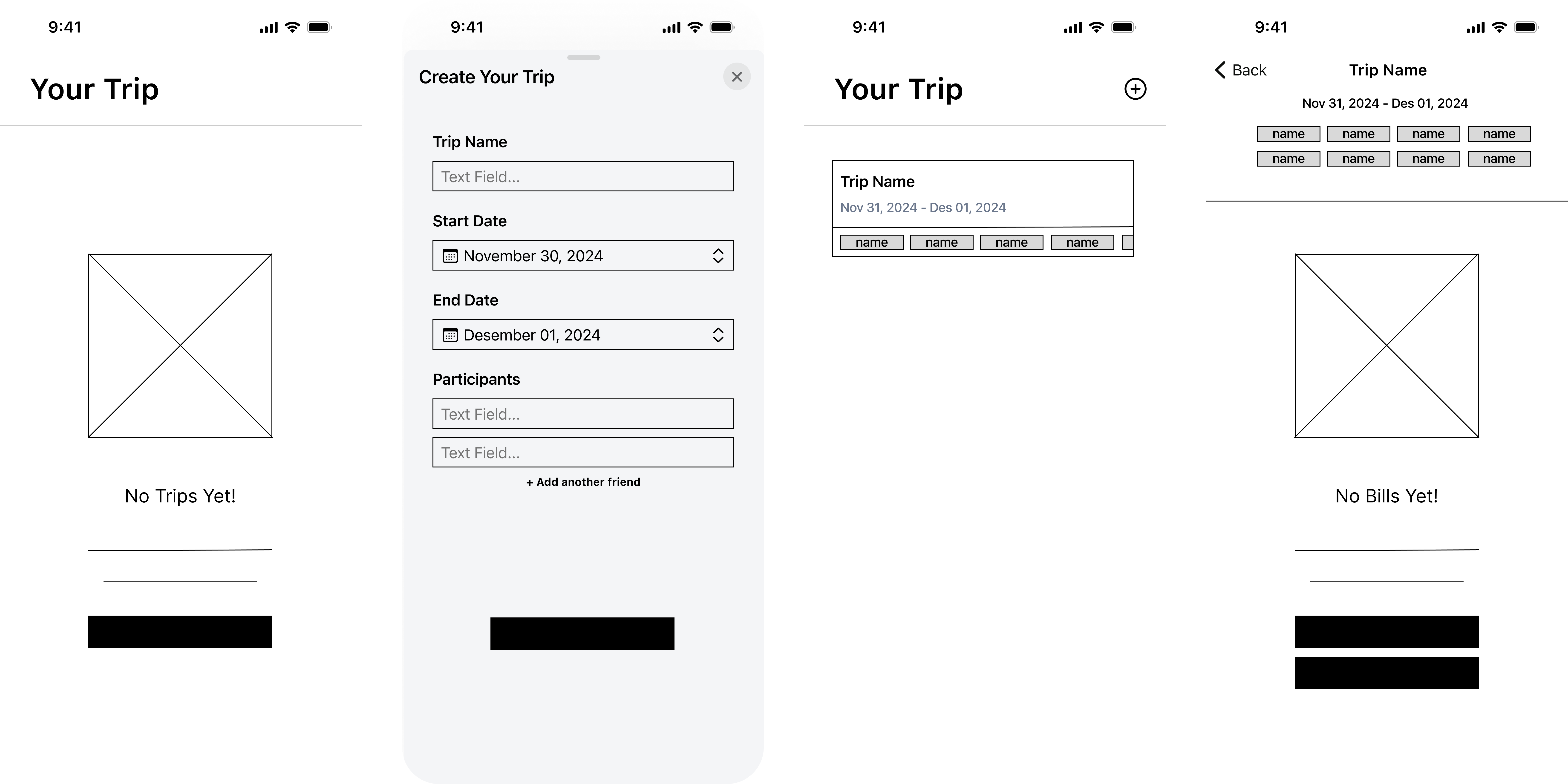 Low-fidelity wireframes were developed based on these findings and refined into high-fidelity prototypes. Multiple user testing sessions were conducted, with user feedback incorporated iteratively to improve flow, clarity, and visual hierarchy. Through these refinements, BillBro evolved into a solution that simplifies the process of calculating, assigning, and tracking shared expenses—ensuring smoother trips and less financial confusion for everyone.
